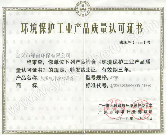 加壓氣浮設(shè)備認(rèn)可證書(shū)